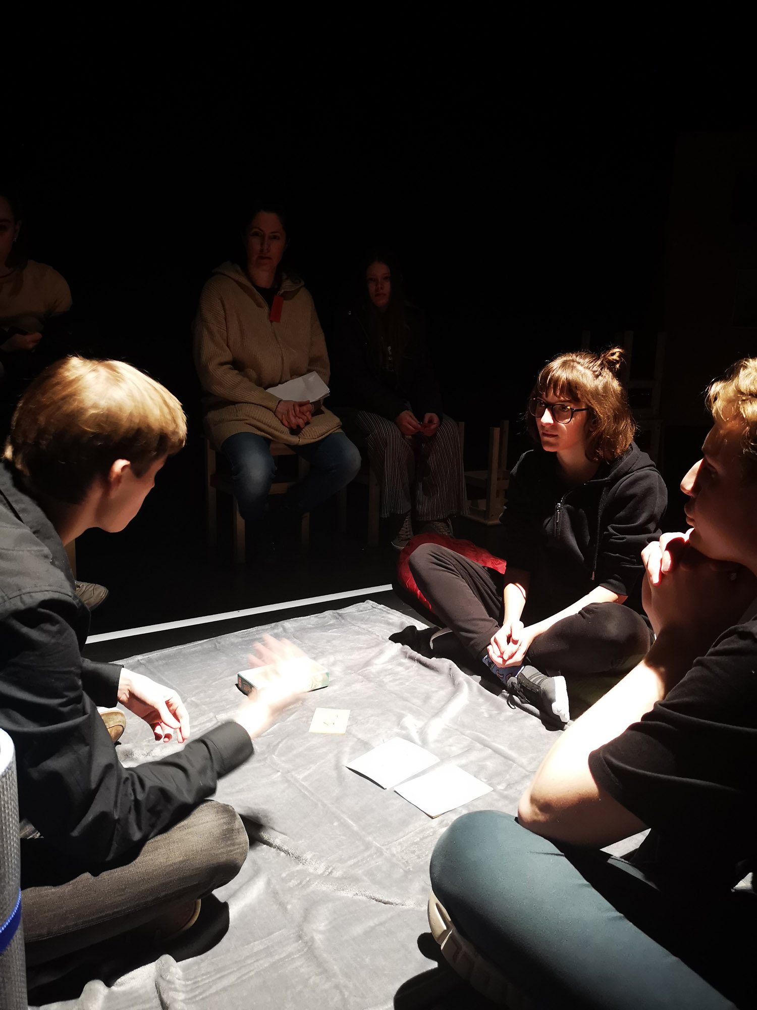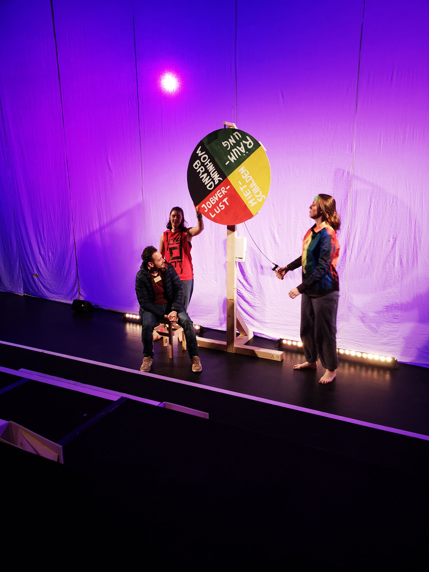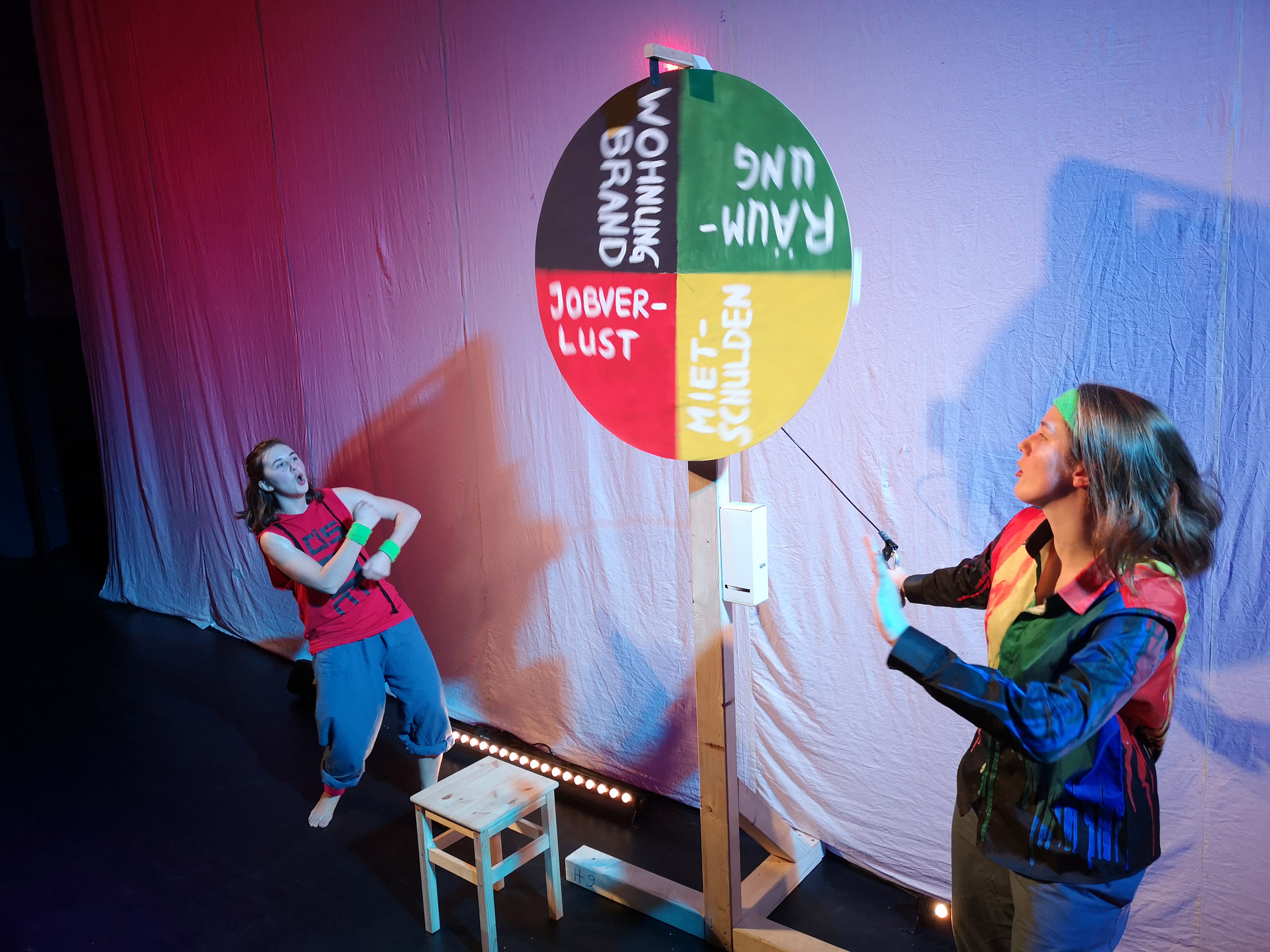 Die Ensemble Mitglieder sind Jugendliche Teilnehmende der jtw und von Wohnungslosigkeit betroffene Menschen. Gemeinsam gestalten und bespielen sie 4 Stationen, die das Thema Obdachlosigkeit betreffen. Im Bürokratie wird ein Unglücksrad gedreht. Im Angstraum fällt der Satz: